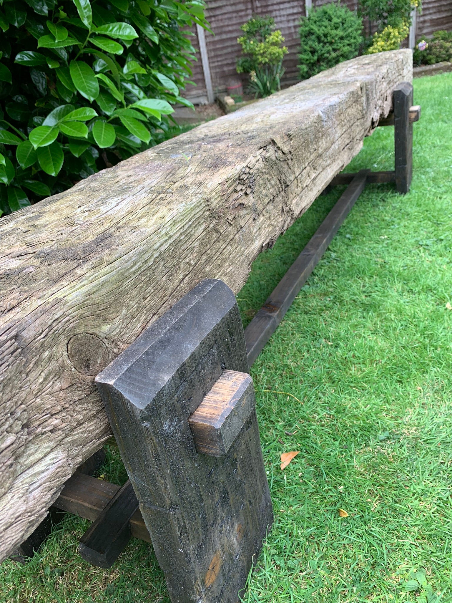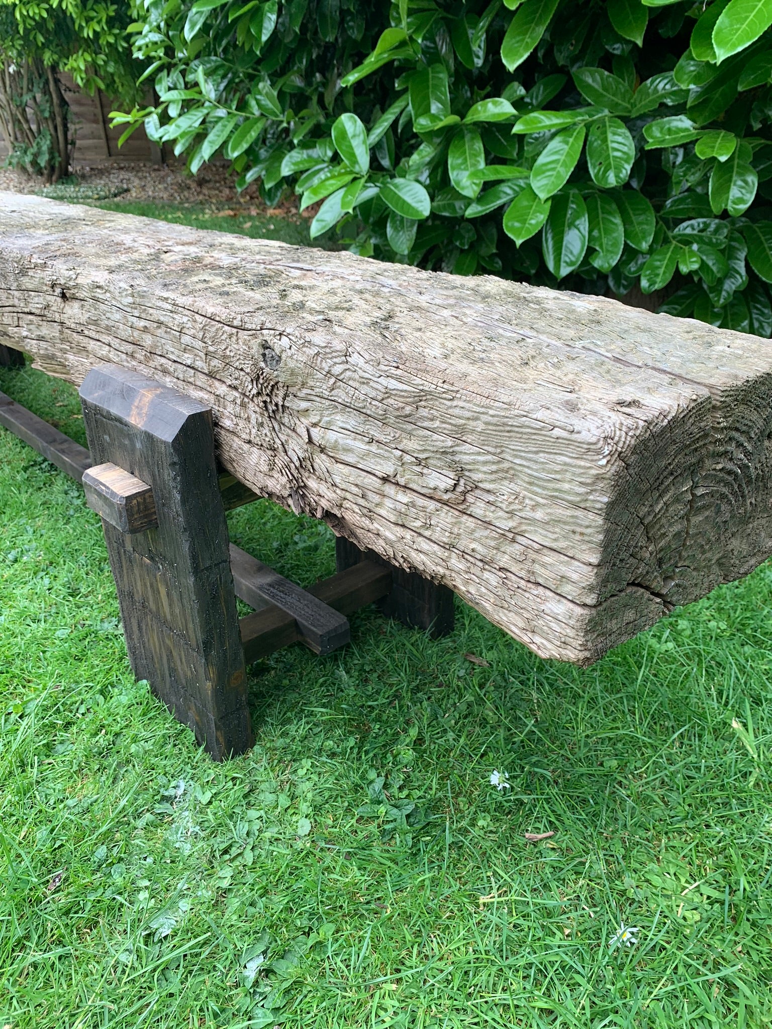 The legs are made from hand selected treated timbers and weathered to give that authentic aged look ready to drop your railway sleeper into place. Choose from a traditional rustic aged sleeper as pictured, or a modern version readily available at your local timber merchant.