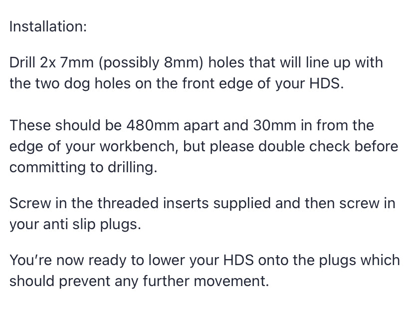 Sold in packs of two, these anti slip plugs can be temporarily inserted into your bench top whilst using your HDS.