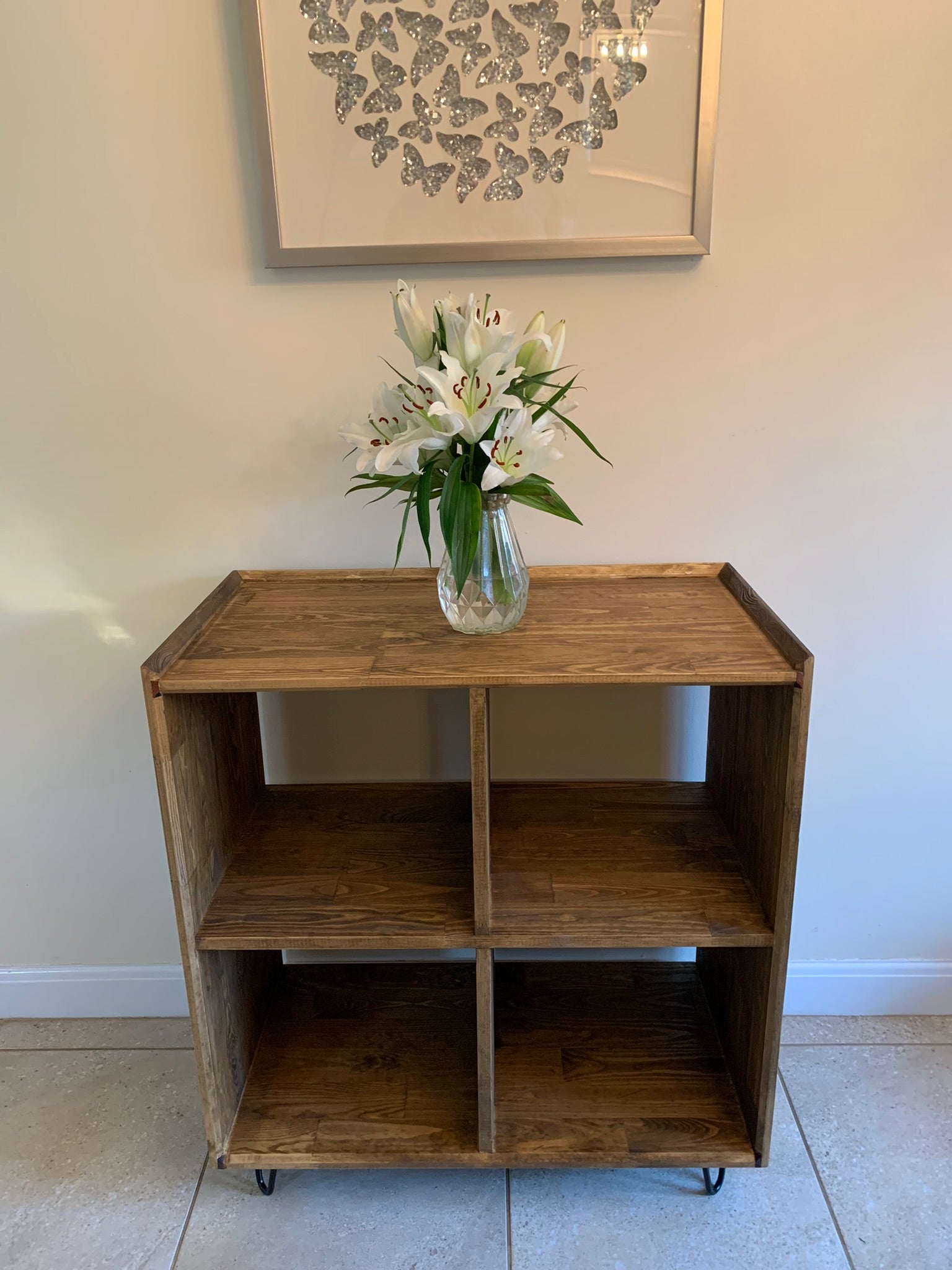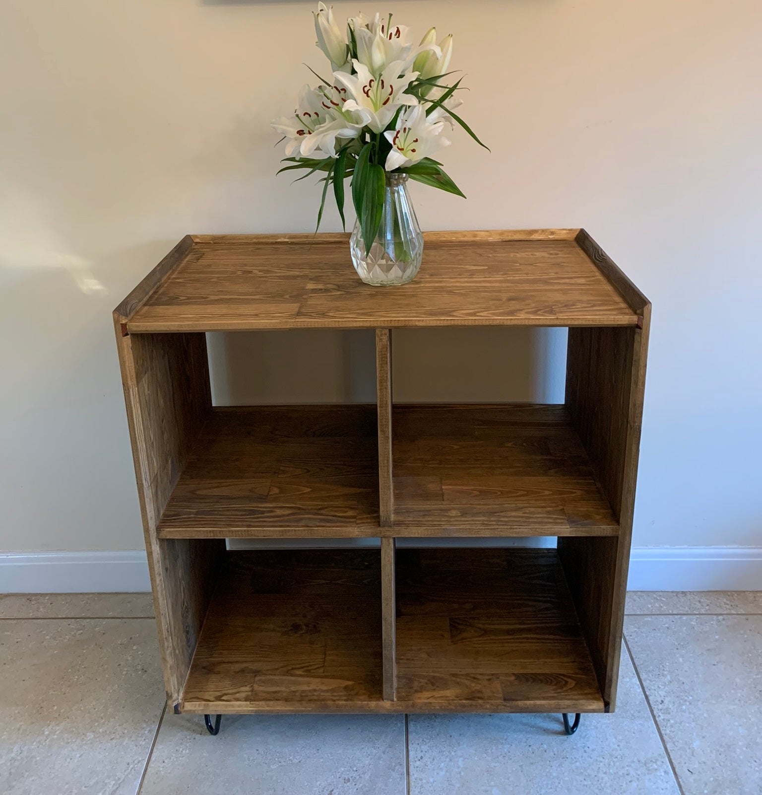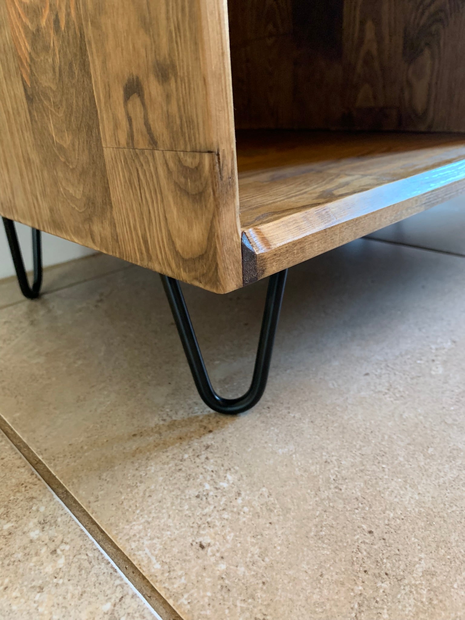 Made from selected timbers, this dark oak open backed shelving unit is the prefect space for turntable and much loved vinyl collection. The hairpin legs give it that simplistic design with a modern twist.